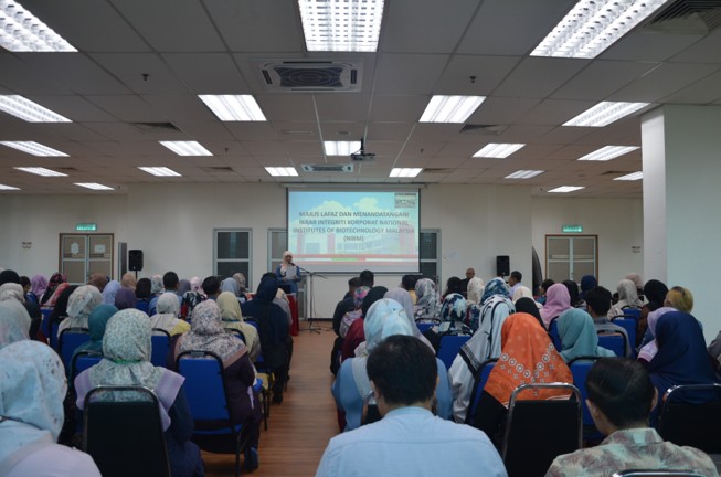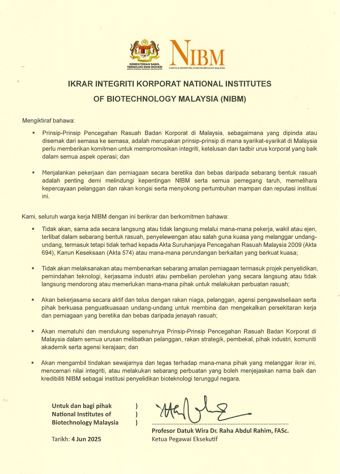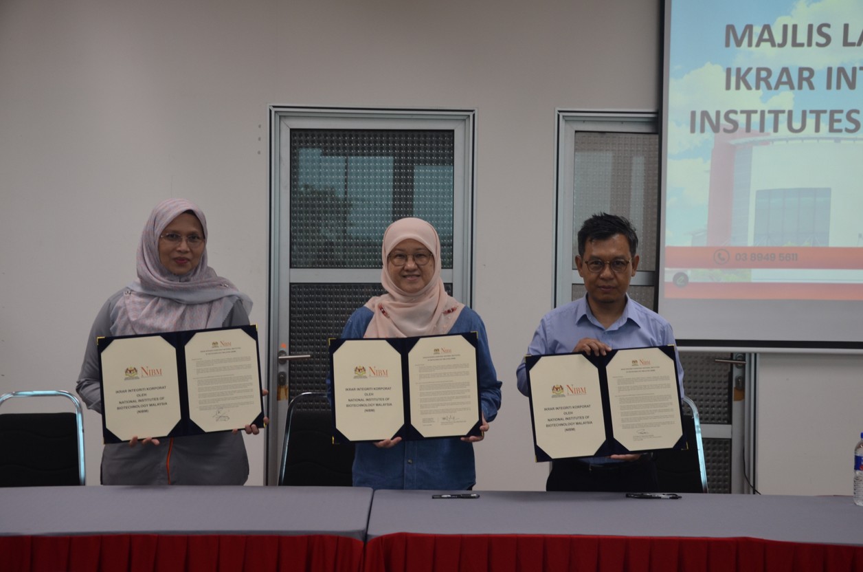 The signing ceremony was officiated by YBhg. Prof. Datuk Wira Dr. Raha Abdul Rahim, FASc, Chief Executive Officer of NIBM and witnessed by Puan Azlina Abdul Ajis, Chief Financial Officer of NIBM. Also present were the Directors of the Institutes under NIBM: Prof. Madya Dr. Syahrilnizam Abdullah, Director of the Malaysia Genome and Vaccine Institute (MGVI); Prof. Madya Dr. Tye Gee Jun, Director of the Malaysian Institute of Pharmaceuticals and Nutraceuticals (IPharm); and Dr. Seetha Jaganathan King, Director of the Agro-Biotechnology Institute (ABI) – symbolising their collective commitment to upholding the values of integrity.